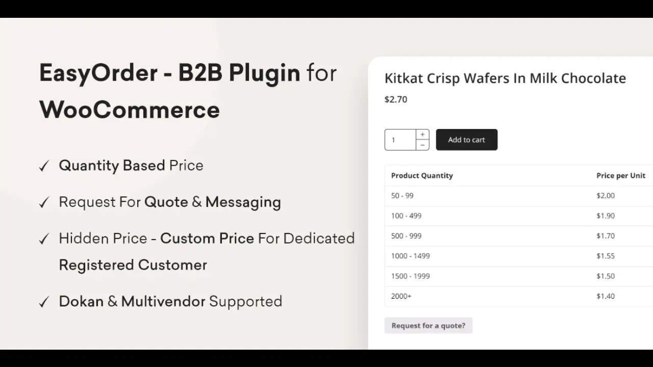 Boost your B2B sales with EasyOrder, the ultimate WooCommerce plugin designed to simplify bulk purchases, wholesale ordering, and business-to-business transactions. Whether you run a wholesale store, distributor business, or offer bulk pricing, EasyOrder enhances the buying experience for your corporate clients with fast, efficient, and user-friendly features.